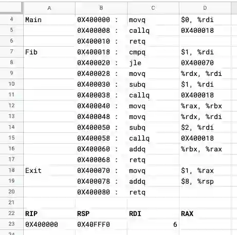 我曾经做过的一个 Google Sheets 页的截图,上面有内存地址和汇编指令。这对于非常仔细地了解整个过程很有帮助。