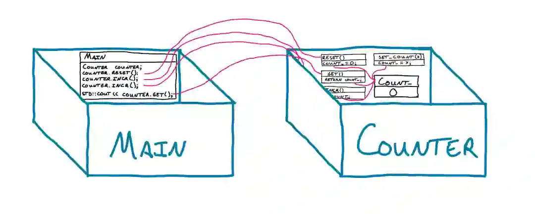 看下面这个基本的例子,我们有一个 Counter 类,它有一个私有的 count_ 变量并提供了各种访问方法。也许它会在一个简单的 main 函数中被访问,做一些计数。