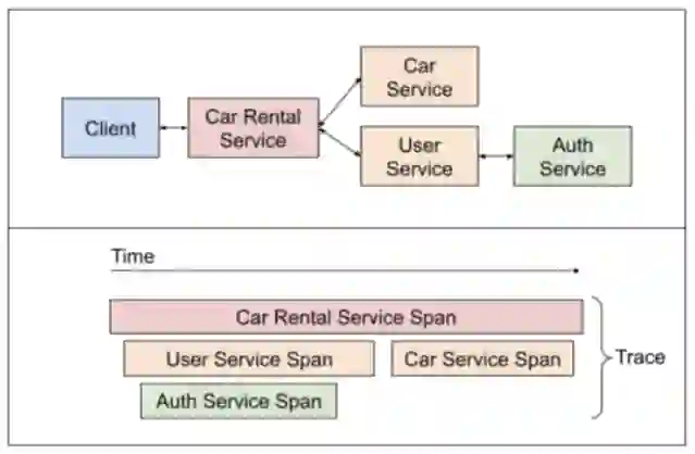 一个简单的面向微服务的汽车租赁服务架构图,以及代表一条执行路径的分布式跟踪。