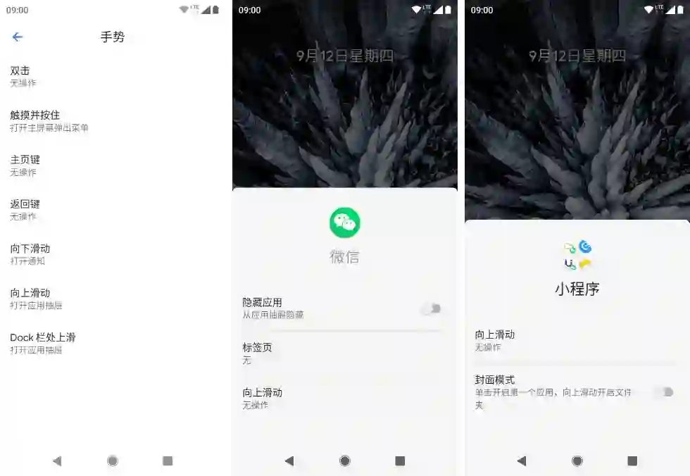 更多的手势支持:相比 V1 中零星散乱的手势设置,V2 为手势单独分离出一个设置页,允许用户选择双击、下滑、上滑、长按等操作所触发的动作。不止于此,主屏幕图标的自定义菜单中我们还可以选择在应用图标上进行上滑可以触发的操作,文件夹中也加入了「封面模式」的选项,允许用户单击开启第一个应用,上滑开启文件夹。补全了 Pixel Launcher 没有手势操作的遗憾。