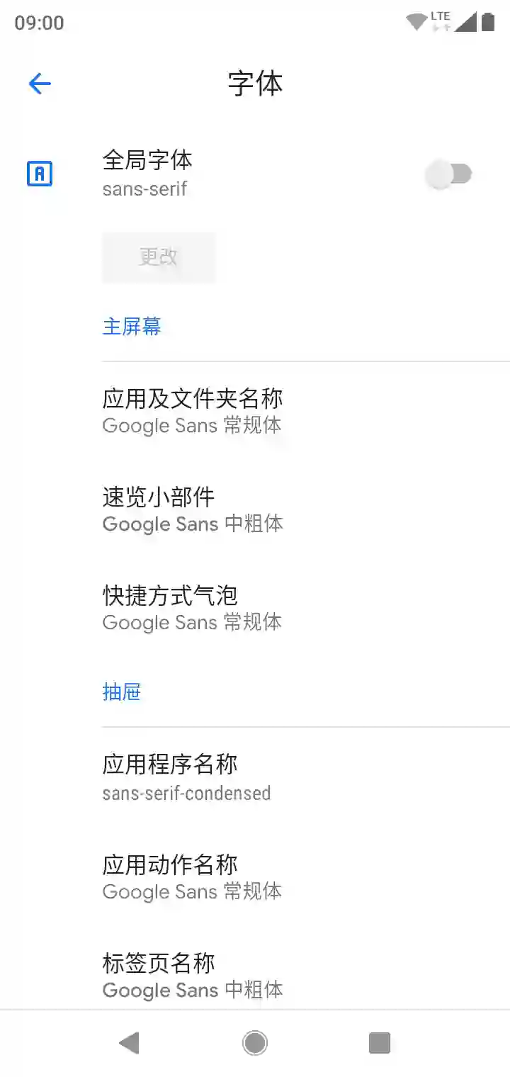 字体更换:Lawnchair 主屏幕和抽屉中所有设计文字显示的部分都已支持了自定义,你还可以添加其他字体进行替换。