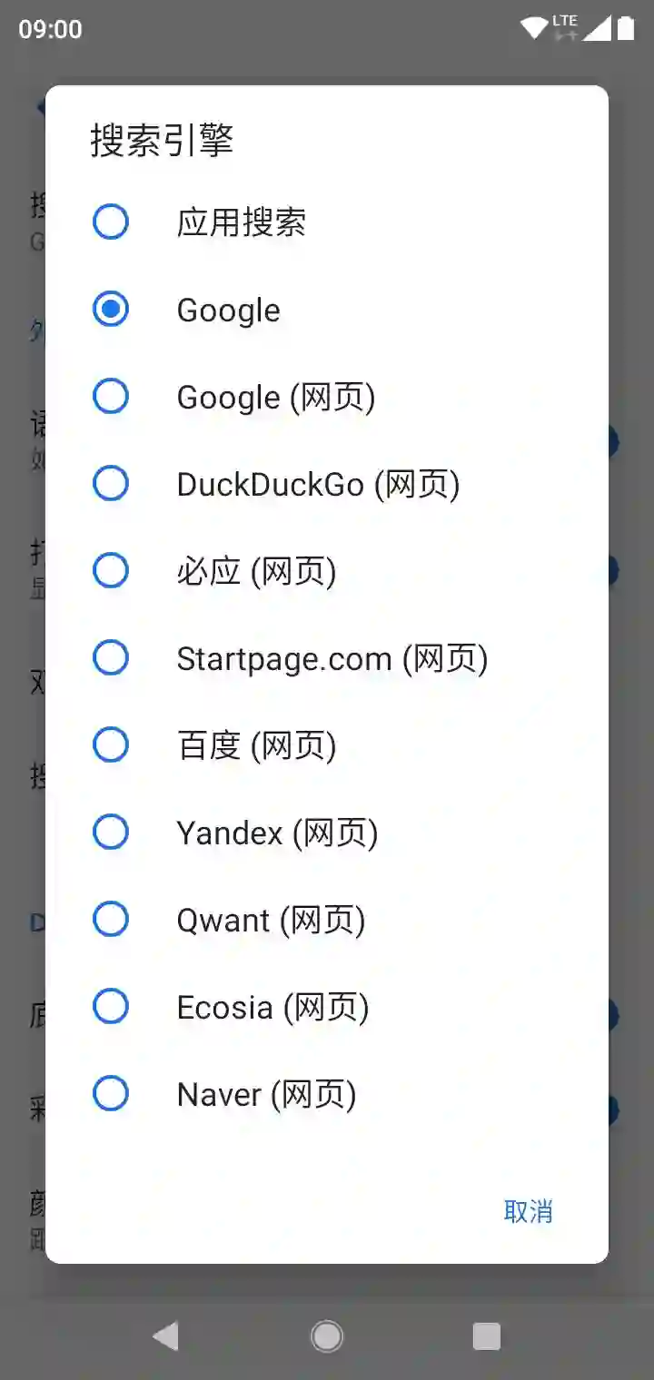 更多的搜索引擎支持:除了默认的 Google 搜索(注意:在使用 Play 版本时可能需要安装 Lawnfeed 以启用搜索框的点击动画),我们既可以选择离线的应用搜索,也可以选择 DuckDuckGo、必应、百度等搜索引擎。