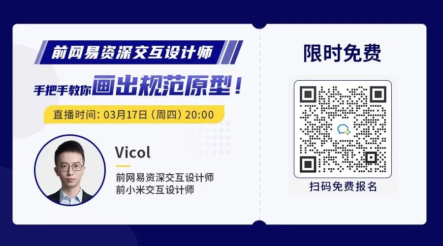 ⭕3月17日(周四)20:00,前网易资深交互设计师、前小米交互设计师@Vicol,1节课带你玩转Axure,手把手教你画出规范原型!