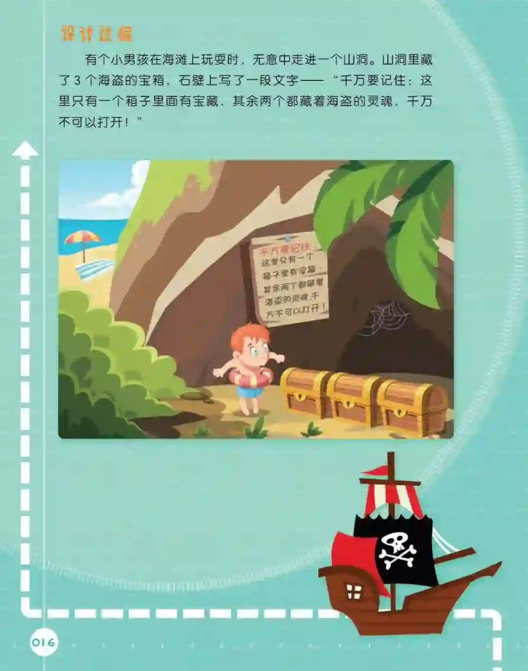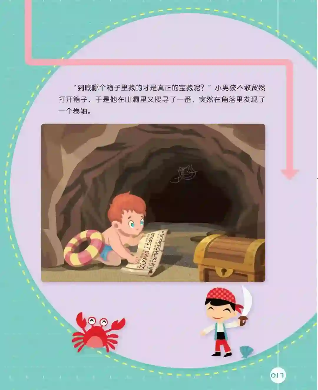 然后的任务是一个寻宝故事,说有一个小孩在海滩上误入一个山洞,看到3个宝箱,但是其中只有一个宝箱有宝藏,其余都藏着海盗的幽灵。