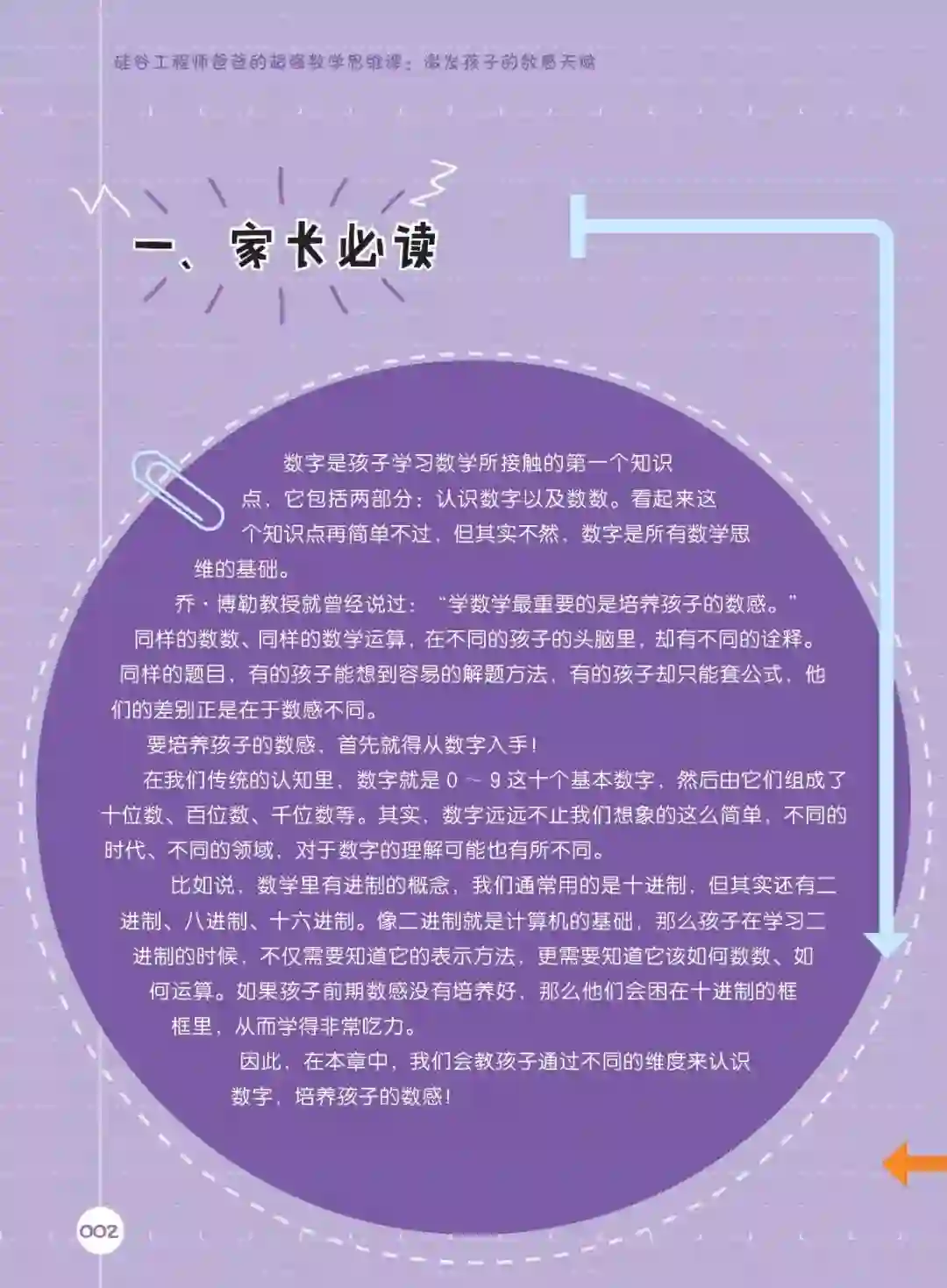 《硅谷工程师爸爸的超强数学思维课》一共两册,分为“数感篇”和“几何篇”,适合4~8岁的孩子和父母阅读。相信一定会对孩子的数学思维提高有莫大的帮助!