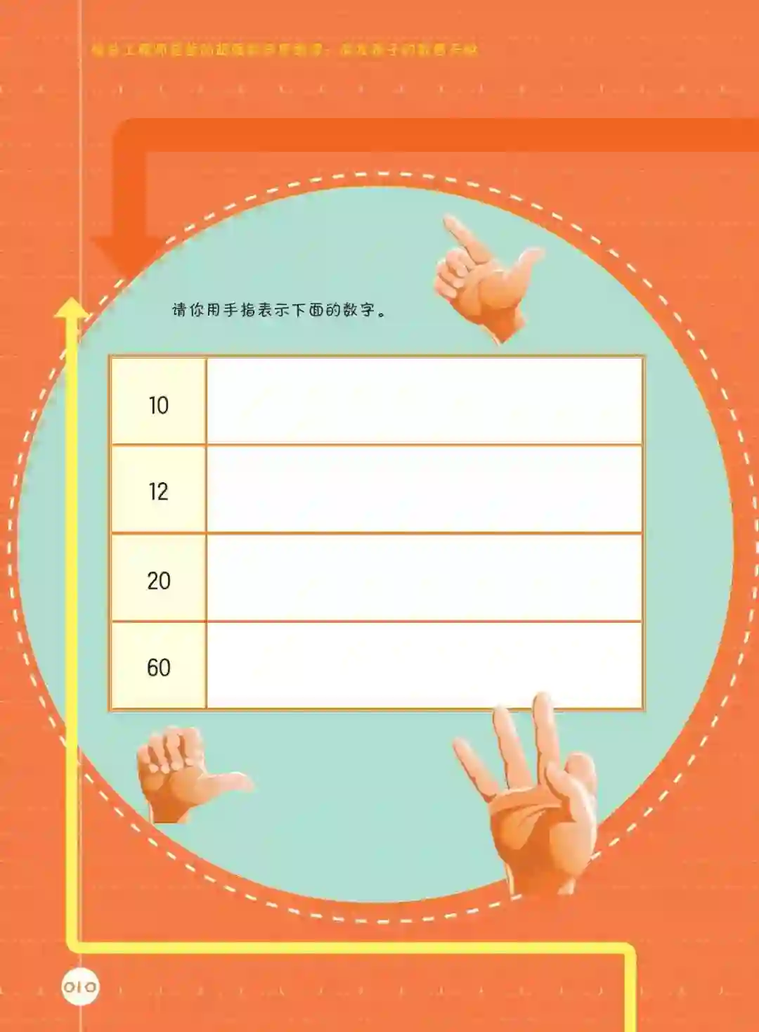 这里面就训练了孩子的思维能力。比如说摆放数字“20”,其实是一只手摆12,另一只手摆8,代表的就是“12+8”这个数学表达式。如果我们直接问孩子“12+8”是多少,每个人都能答得出来。但是像题目这样用具体的应用场景展现出来,让孩子自己去挖掘“12+8”这个表达式的含义,就很有难度了,因为他们得理解题目的框架和内容,才能做出正确的判断。这也是数感训练最核心的要求!