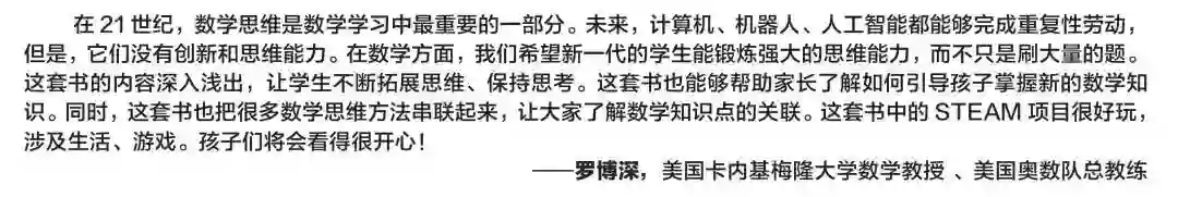 这套书写完后,憨爸还特地请卡内基梅隆大学数学系教授、美国奥数队总教练罗博深教授指点。因为罗教授是这方面的全球顶尖权威之一,他指点可以让这套书更完美。罗教授极少给人背书,却为这套书写了一段推荐语,足见他对这套书的认可。这更让我们相信,这套书能帮到大家。