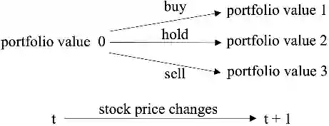 考虑到交易市场的随机性和互动性,研究者将股票交易过程建模为如下图所示的马尔可夫决策过程(Markov Decision process, MDP),具体如下: