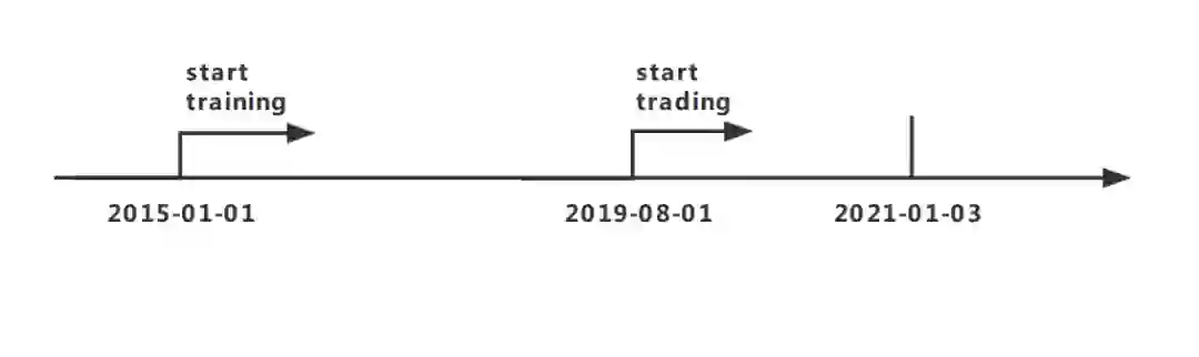 实验包括三个阶段,即训练、验证和交易。在训练阶段,首先使用 DDPG 算法生成一个训练有素的交易智能体。然后在验证阶段调整关键参数,如 learning rate 和 episode 的大小等。最后在交易阶段,对训练得到的智能体的盈利能力进行评估。因此,整个数据集被分为两个部分,如下图所示。训练使用 2015 年 1 月 1 日至 2019 年 8 月 1 日的数据,测试使用 2019 年 8 月 1 日至 2021 年 1 月 3 日的数据。