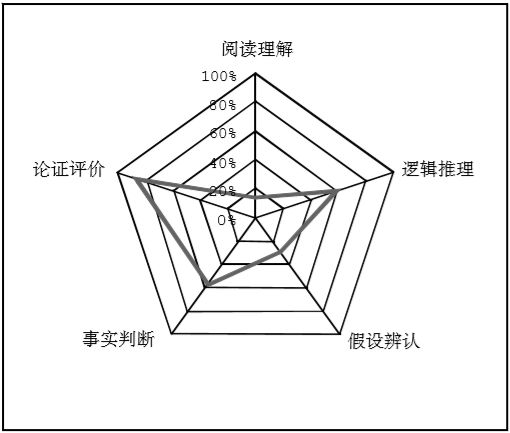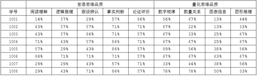 根据表3和图1、图2,教师或学生很容易了解到每个人思维品质的结构特点和水平。比如,对于学号为1001的学生,从图1我们很容易发现其言语思维品质中的“阅读理解”能力发展得相对较弱,其领域掌握分数仅仅为14%。这表明该学生领会并解释阅读材料的能力不强,其信息理解、分析、综合和概括的能力有待提升。与此同时,该学生言语思维品质中的“论证评价”能力相对较强,其领域掌握分数为86%。这表明他独立思考和质疑论点、论据、论证过程的准确性、充分性、必要性及恰当性等能力较强。此外,由图2发现,该学生量化思维品质中把握“图表信息”的能力比较弱,其领域掌握分数仅仅为13%。这表明他从图表中获取有效信息、对数据进行分析和整合的能力有限,其解决综合性问题的能力有待提升。显然,这些信息为制定1001学号学生的个性化教与学方案提供了科学依据。