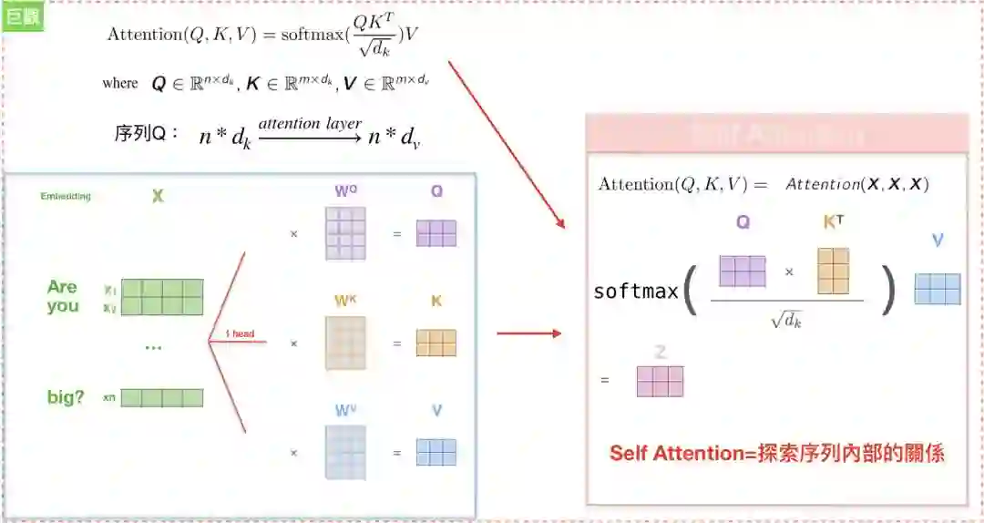 输入句中的每个文字是由一系列成对的 <地址Key, 元素Value>所构成,而目标中的每个文字是Query,那麼就可以用Key, Value, Query去重新解释如何计算context vector,透过计算Query和各个Key的相似性,得到每个Key对应Value的权重係数,权重係数代表讯息的重要性,亦即attention score;Value则是对应的讯息,再对Value进行加权求和,得到最终的Attention/context vector。