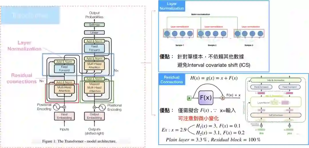 Residual connection 就是构建一种新的残差结构,将输出改写成和输入的残差,使得模型在训练时,微小的变化可以被注意到,这种架构很常用在电脑视觉(computer vision),有兴趣可以参考神人Kaiming He的Deep Residual Learning for Image Recognition。