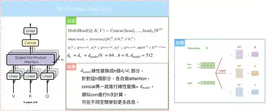 有趣的是,如果我们只计算一个attention,很难捕捉输入句中所有空间的讯息,为了优化模型,论文当中提出了一个新颖的做法:Multi-head attention,概念是不要只用d_{model}维度的key, value, query们做单一个attention,而是把key, value, query们线性投射到不同空间h次,分别变成维度d_{q}, d_{k} and d_{v},再各自做attention,其中,d_{k}=d_{v}=d_{model}/h=64,概念就是投射到h个head上。