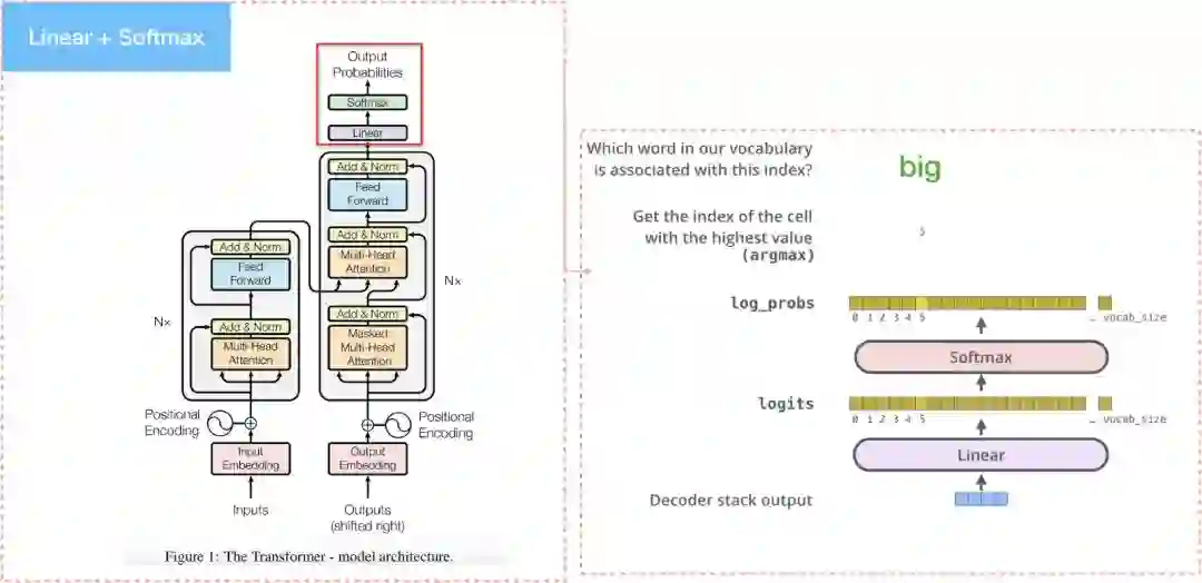 Decoder最后会產出一个向量,传到最后一层linear layer后做softmax。Linear layer只是单纯的全连接层网络,并產生每个文字对应的分数,softmax layer会将分数转成机率值,最高机率的值就是在这个时间顺序时所要產生的文字。