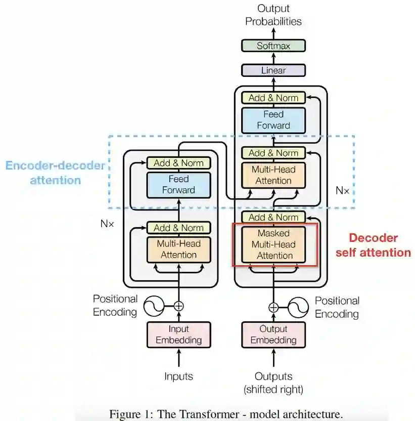 不同的地方是,为了避免在解码的时后,还在翻译前半段时,就突然翻译到后半段的句子,会在计算self-attention时的softmax前先mask掉未来的位置(设定成-∞)。这个步骤确保在预测位置i的时候只能根据i之前位置的输出,其实这个是因应Encoder-Decoder attention 的特性而做的配套措施,因为Encoder-Decoder attention可以看到encoder的整个句子,