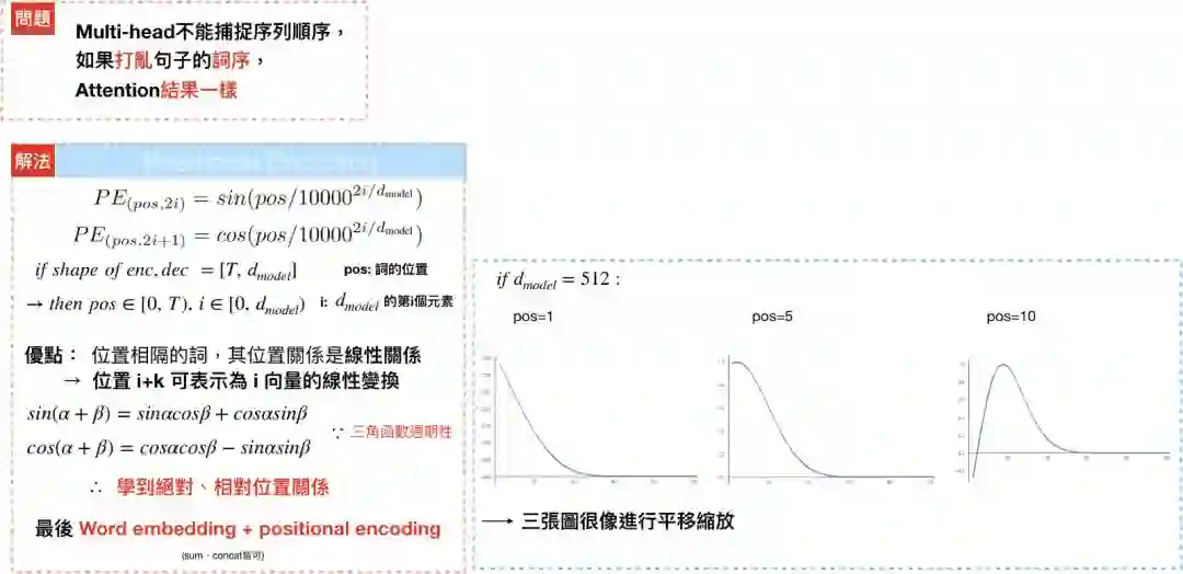 论文使用了方程式PE(pos, 2i)=sin(pos/10000^{2i/d_{model}})、PE(pos, 2i+1)=cos(pos/10000^{2i/d_{model}})来计算positional encoding,pos代表的是位置,i代表的是维度,偶数位置的文字会透过sin函数进行转换,奇数位置的文字则透过cos函数进行转换,藉由三角函数,可以发现positional encoding 是个有週期性的波长;举例来说,[pos+k]可以写成PE[pos]的线性转换,使得模型可以学到不同位置文字间的相对位置。