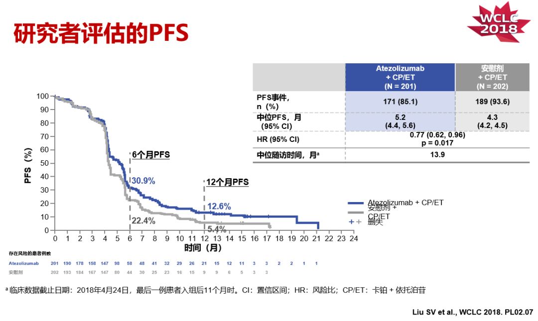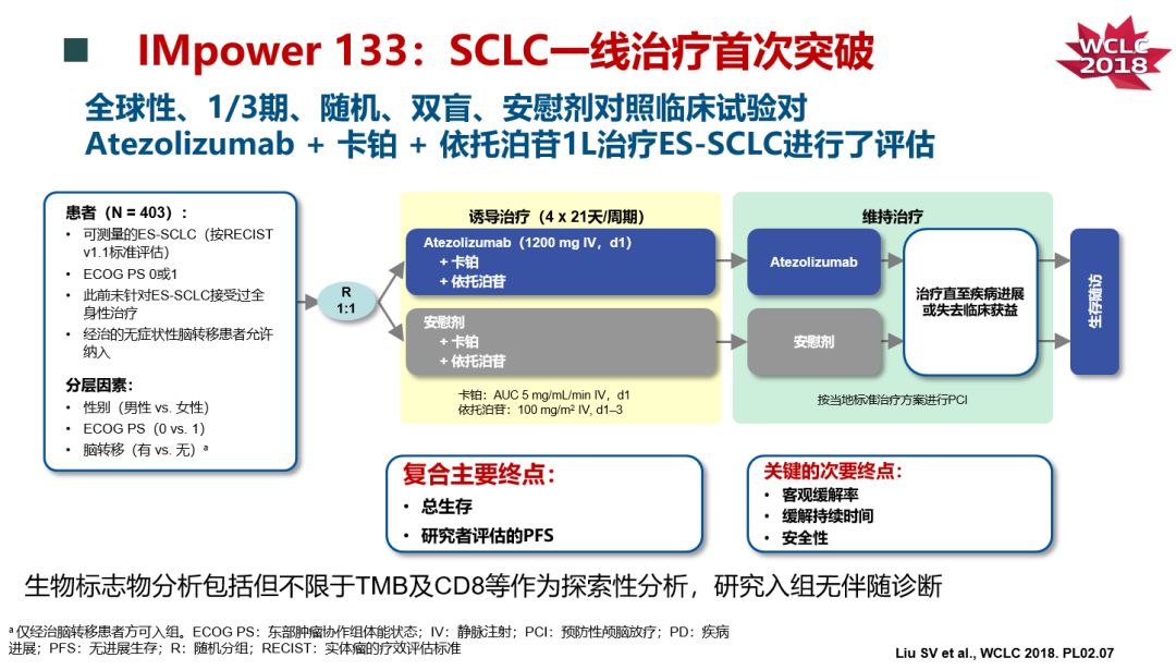 IMpower133是一项多中心、随机、双盲、安慰剂对照的3期临床研究,旨在评估Atezolizumab+化疗(卡铂+依托泊苷)相比较于化疗对初治广泛期小细胞肺癌的疗效和安全性。研究将403例患者1:1随机分组,分别接受Atezolizumab+化疗(Atezolizumab治疗组),或安慰剂+化疗(对照组);诱导治疗4周期(21天/周期)后Atezolizumab或安慰剂维持治疗,直至疾病进展。