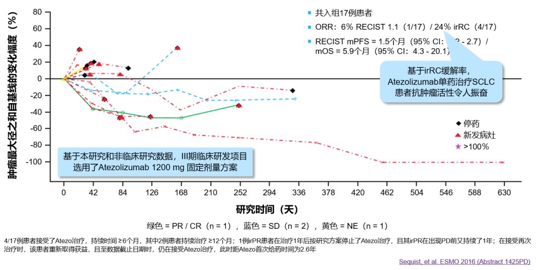 PCD4989g是一项小样本量Ⅰ期单臂临床研究,旨在评估Atezolizumab单药治疗难治性广泛期小细胞肺癌的临床获益。PCD4989g的初步疗效和安全性结果为Atezolizumab治疗广泛期小细胞肺癌提供了前期证据。同时该研究和Atezolizumab非临床研究数据为IMpower133选用Atezolizumab 1200 mg 固定剂量方案提供了参考依据。