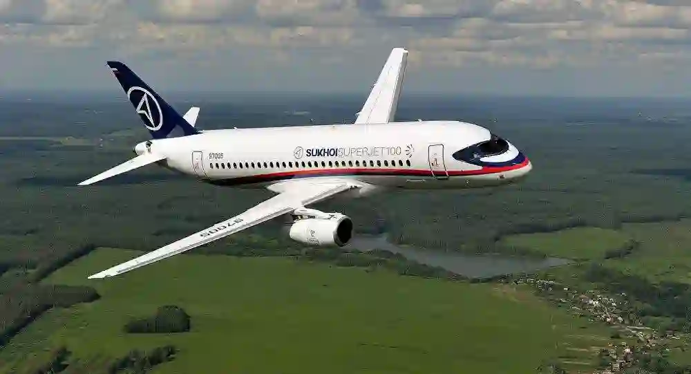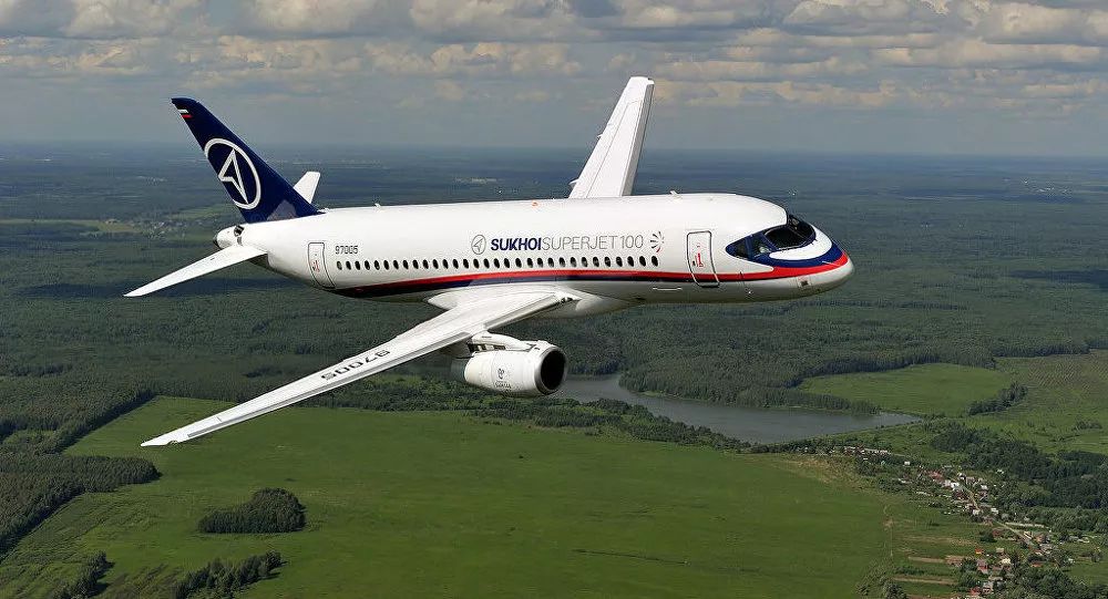 SSJ100 由联合航空制造集团下苏霍伊民机公司(SCAC)研制,分为基本型和远程型,有 60 座、75 座和 95 座三种布局。其中 95 座基本型设计起飞重量为 45 吨,航程 4590 公里,最大巡航高度 10200 米,最大巡航速度 0.78 马赫,售价约为 2800 万美元。该机型已经于 2007 年 9 月下线,2008 年 5 月首飞,2011 年 4 月投入运营,和中国的 ARJ21 属于同一级别,但进度领先于 ARJ21-700。