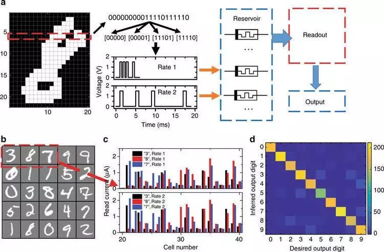 图 | 基于忆阻器的手写数字识别(图片来自 《自然·通信》 Reservoir computing using dynamic memristors for temporal information processing )