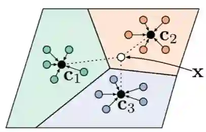 如图 6 所示,c1、c2、c3 分别是三个类别的均值中心(称 Prototype),将测试样本 x 进行 embedding 后,与这 3 个中心进行距离计算,从而获得 x 的类别。