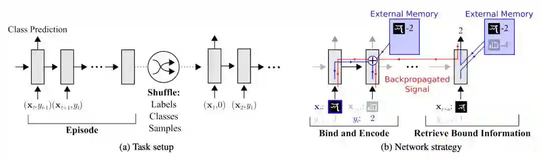Santoro 等人 [3] 提出使用记忆增强的方法来解决 Few-shot Learning 任务。基于记忆的神经网络方法早在 2001 年被证明可以用于 meta-learning。他们通过权重更新来调节 bias,并且通过学习将表达快速缓存到记忆中来调节输出。
