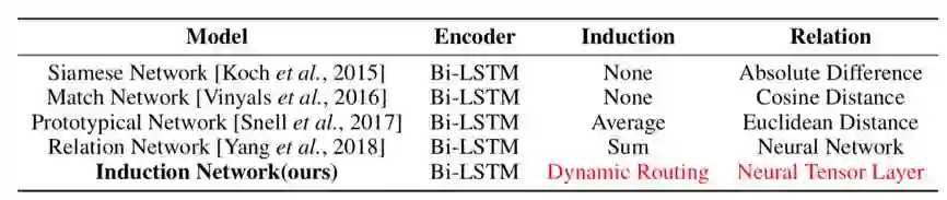 如表 1 所示,之前的工作往往致力于学习不同的距离度量方式,而忽视了从样本表示到类表示的建模。而在自然语言当中,由于每个人的语言习惯不同,同一个类别的不同表述往往有很多种,如果仅仅是简单加和或取平均来作为类别的表示,这些与分类无关的干扰信息就会累加,影响最终的效果。