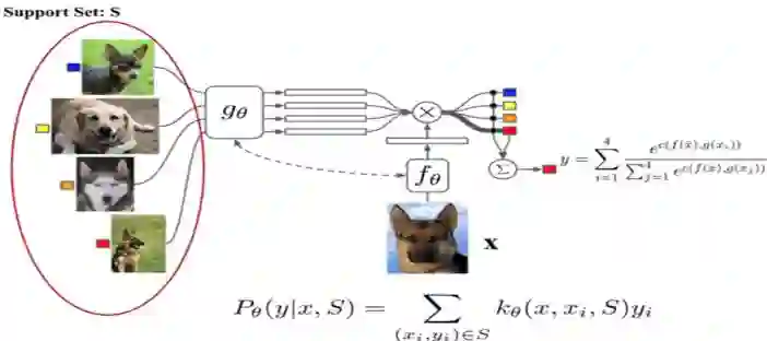 相比孪生网络,匹配网络(Match Network)[2] 为支撑集和 Batch 集构建不同的编码器,最终分类器的输出是支撑集样本和 query 之间预测值的加权求和。