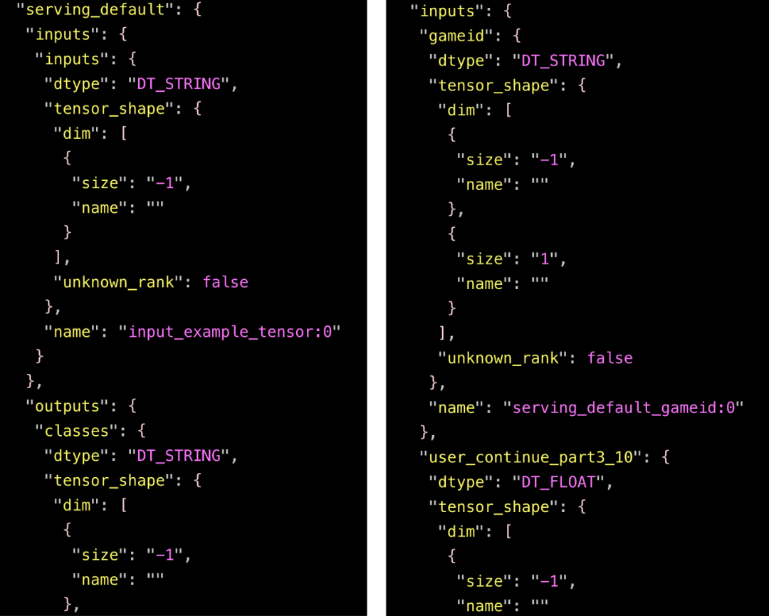 那么为什么在 TF1 的时候,没有这个问题呢?因为不同于 TF1 的 tf.feature_column + tf.estimator 的组合,使用 TF2 的 tf.feature_column + tf.keras 的组合导出的模型有多个输入。下面的截图分别展示了两种组合的(部分)输入。