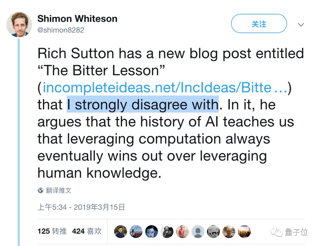 牛津大学计算机系教授希蒙·怀特森(Shimon Whiteson)连发13条Twitter反驳萨顿的观点,表示“坚决不同意”,同样获得了大量支持。