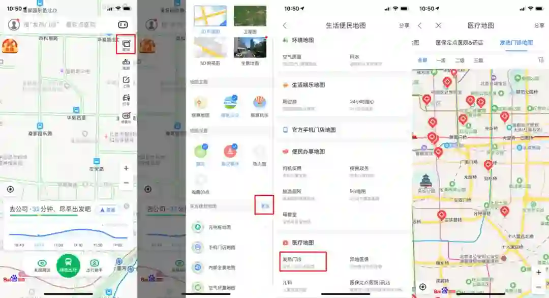 1月23日消息,针对新型肺炎,百度地图依据卫健委官方数据,已紧急上线“发热门诊地图”,用户可直接点击进入查看附近所有发热门诊的医疗机构,或者直接搜索医疗机构,在POI详情页中查看到设有24小时发热门诊的医院。