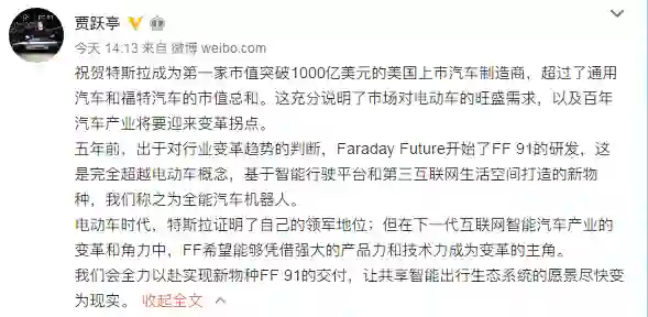 表示特斯拉达到如此高得市值,这充分说明了市场对电动车的旺盛需求,以及百年汽车产业将要迎来变革拐点。