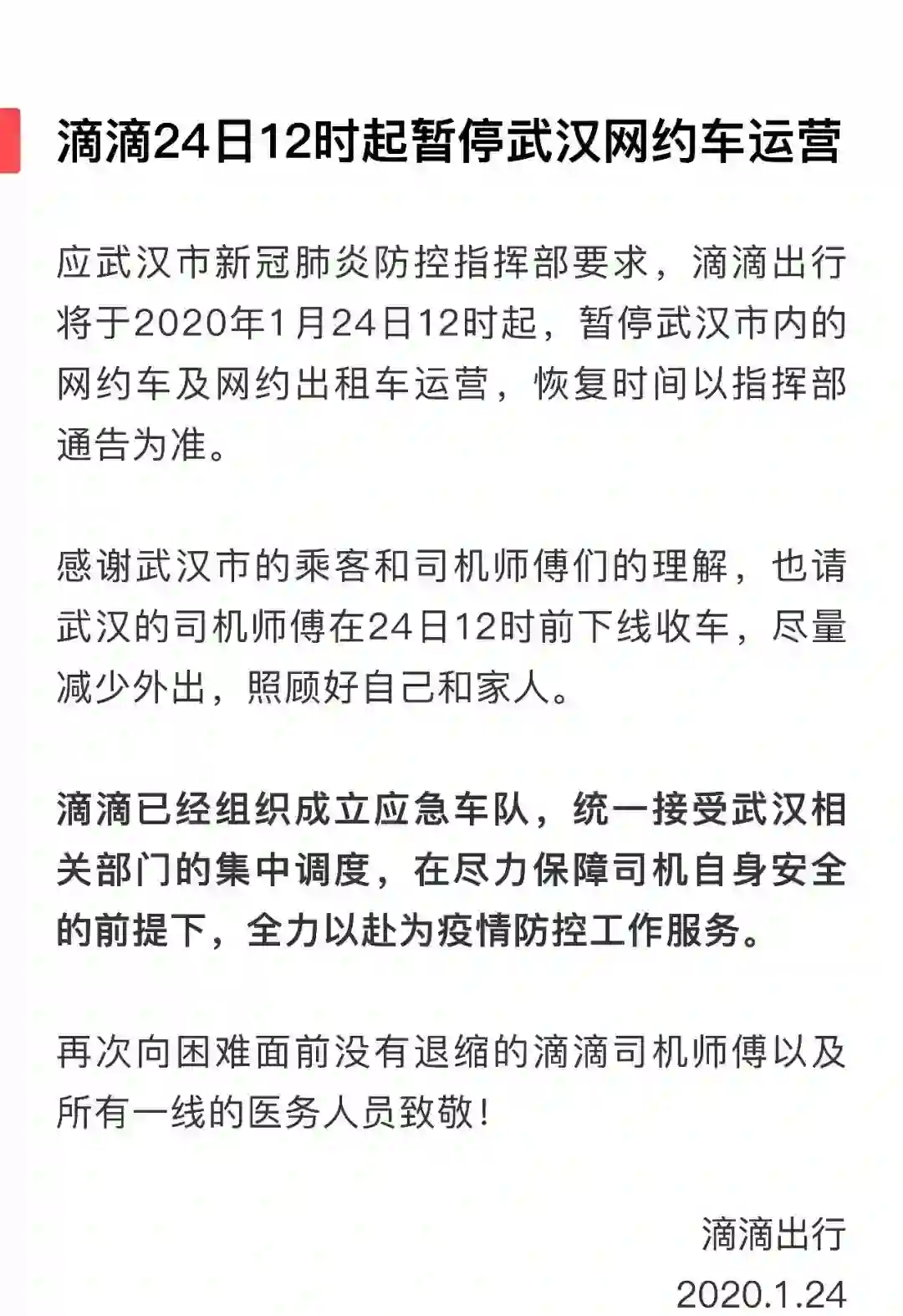 【滴滴将在1月24日12时起暂停武汉网约车运营】