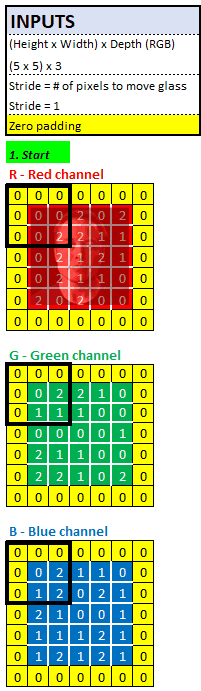 为了创建1个特征映射(一条线索),夏洛克从取出一个放大镜,并置于输入图像的左上角开始。红层玻璃只能看到红输入图像,绿层玻璃只能看到绿图,而蓝层玻璃只能看到蓝图。