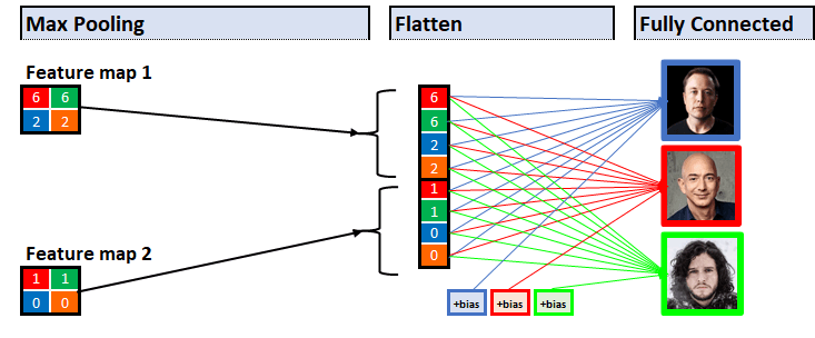 在扁平层的每份证据和3个输出之前是一组权重和偏置。类似网络中的其他权重,这些值会在刚开始训练CNN的时候随机初始化,而随着时间的推移,CNN将“学习”如何调整这些权重/偏置以得到更精确的预测。
