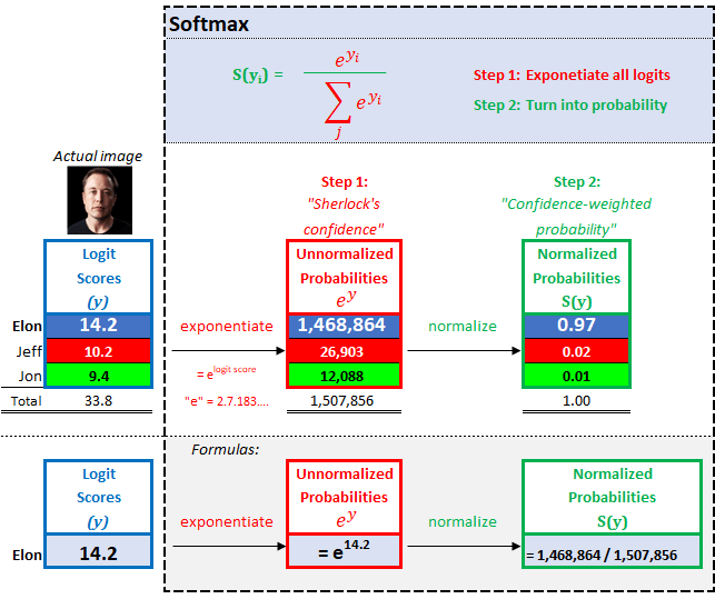 为了得出夏洛克的置信度,我们以e(等于2.71828…)为底数,以logit得分为指数。这样,一个较高的得分将变为非常高的置信度,而一个较低的得分将变为非常低的置信度。