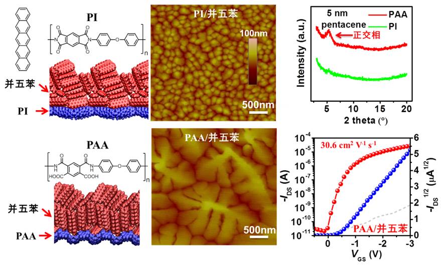 最近研究人员发现聚酰亚胺PI的热前驱体聚酰胺酸 PAA 薄膜表面强极性和纳米沟槽结构能选择性诱导并五苯分子站立生长,聚集形成有利于电荷传输的正交相,并且能进一步形成尺寸大、晶界少的高晶态薄膜,迁移率高达30.6 cm2 V-1 s-1,是迄今为止并五苯薄膜器件的最高值,也是有机半导体最高迁移率的少数例子之一。进一步发现 PAA 能诱导结晶度更高的并四苯、酞菁铜等有机半导体晶态膜的生长,验证了表面纳米沟槽诱导作用的普适性,为构筑高性能的有机半导体器件提供一种新的思路和方法(J. Am. Chem. Soc. 2017, 139, 2734)。