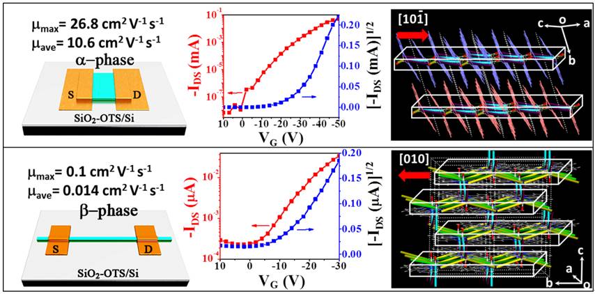 有机分子大多是通过极弱的范德华力相互作用而形成晶体,因此多晶相是有机半导体材料中非常普遍的一种现象。不同堆积结构的晶相具有不同的电子耦合作用,从而导致不同的电荷传输行为。如何可控组装生长高迁移率的晶相一直以来都是分子电子学中一个极具有挑战性的课题,涉及到分子结构、晶体工程和超分子自组装等多方面的内容。