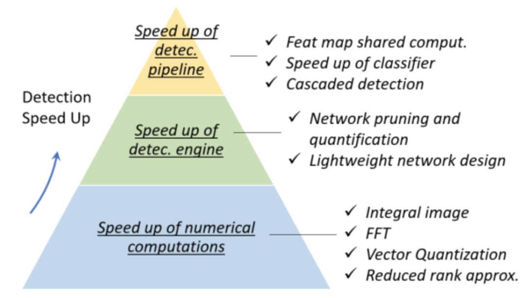 加速目标检测一直是一个重要而又具有挑战性的问题。在过去的20年里,目标检测领域已经发展了复杂的加速技术。这些技术大致可以分为 “ 检测管道提速 ”、“ 检测引擎提速 ” 和 “ 数值计算提速 ” 三个层次,如下图所示。