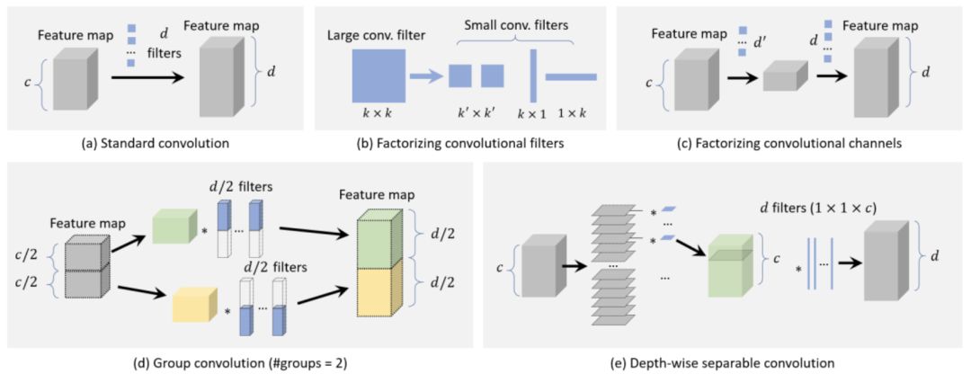 第一类方法是将一个大的卷积滤波器分解成一组空间维数较小的卷积滤波器,如上图(b)所示。例如,可以将一个7x7过滤器分解为三个3x3过滤器,它们共享相同的接收域,但是后者效率更高。另一个例子是将 k×k 滤波器分解为k×1滤波器和1×k滤波器,这对于非常大的滤波器来说可能更有效,比如15x15。该思想最近被用于目标检测。