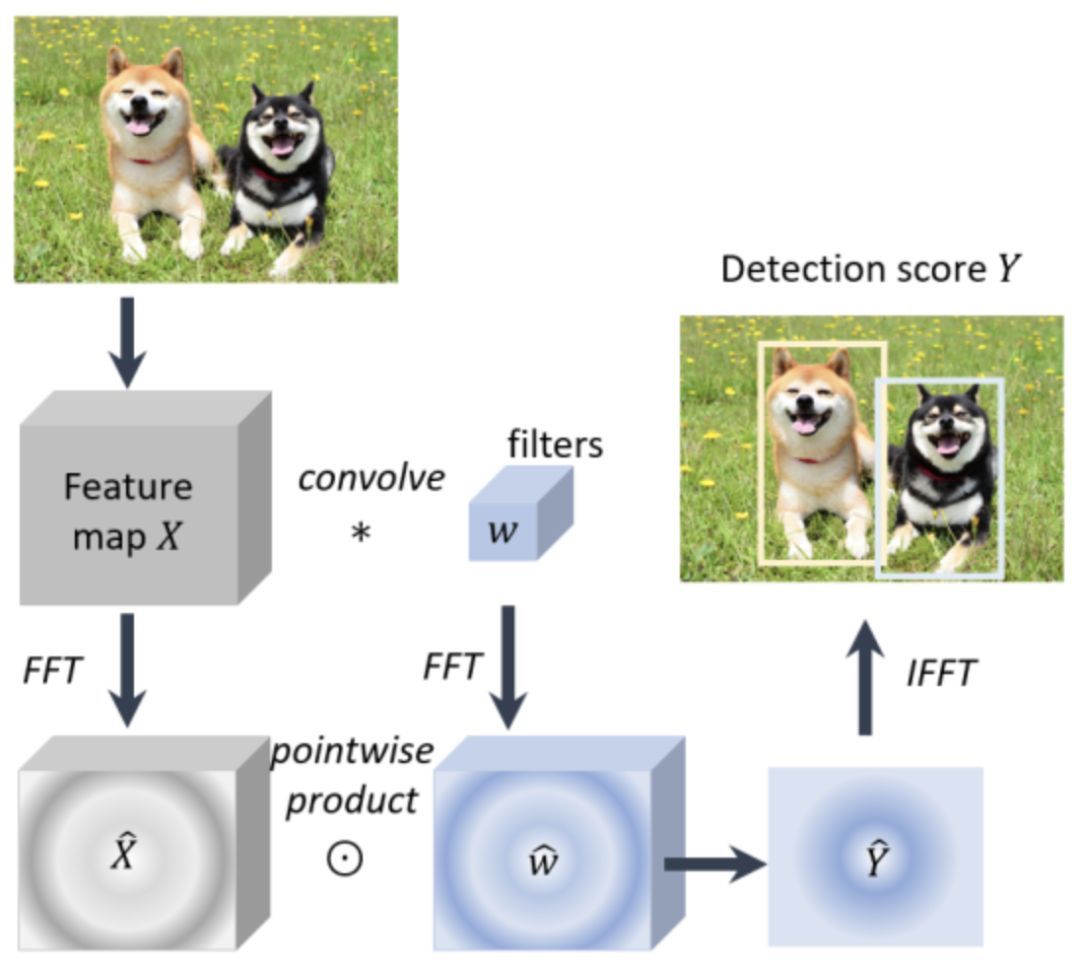 其中,F是傅里叶变换,F-1是傅里叶反变换,I和W是输入图像和滤波器,是卷积运算,是点乘运算。利用快速傅里叶变换 ( Fast Fourier Transform,FFT )和快速傅里叶反变换 ( Inverse Fast Fourier Transform,IFFT )可以加速上述计算。FFT 和 IFFT 现在经常被用来加速 CNN 模型和一些经典的线性目标检测器,这使得检测速度提高了一个数量级。下图为在频域中加速线性目标检测器的标准管道 ( 如 HOG 和 DPM )。