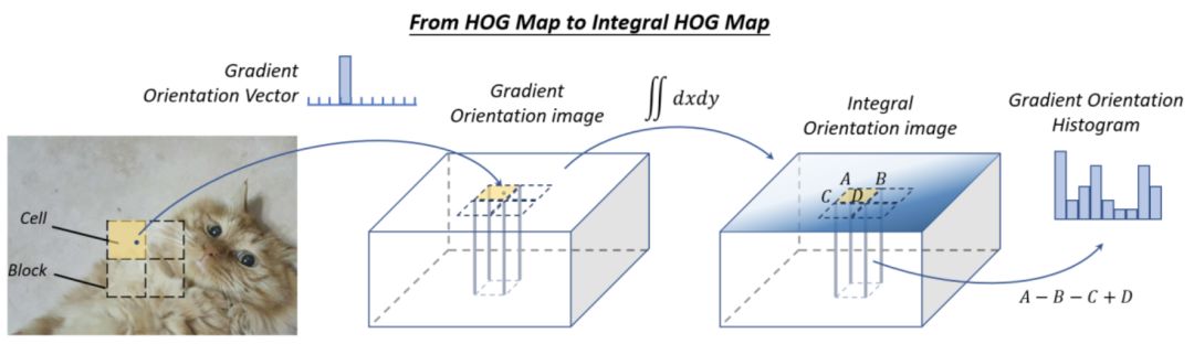 除了上面的例子,积分图像还可以用来加速目标检测中更一般的特征,例如颜色直方图,梯度直方图等。一个典型的例子就是通过计算积分HOG映射加速HOG。积分HOG映射不是在传统的积分图像中积累像素值,而是在图像中积累梯度方向,如下图所示。由于cell的直方图可以看作是某一区域梯度向量的和,利用积分图像可以计算任意位置和大小的矩形区域的直方图,计算开销是恒定的。积分HOG映射已被应用于行人检测中,并在不损失任何精度的前提下实现了数十倍的加速度。