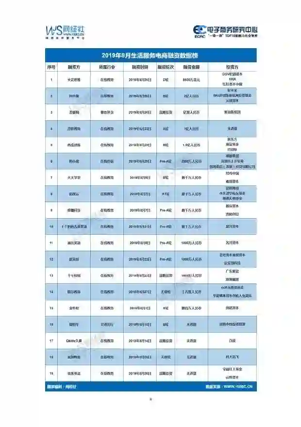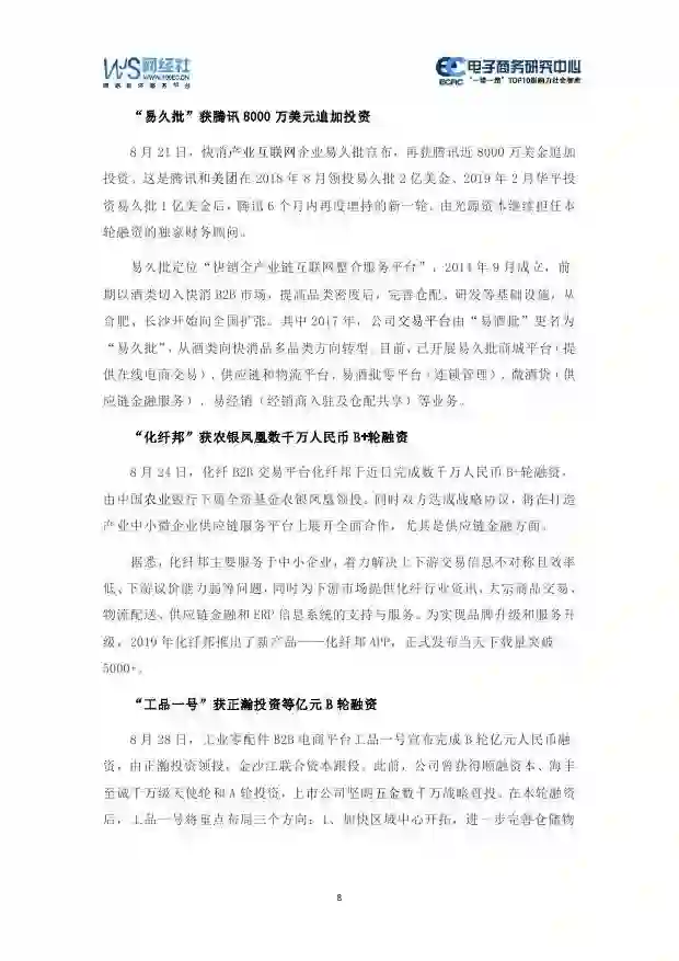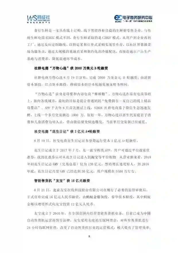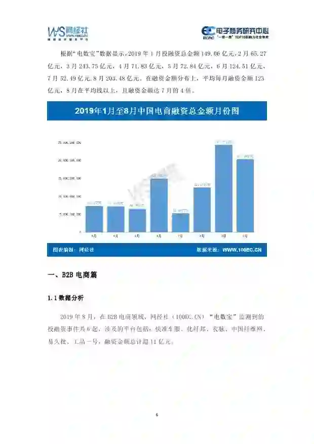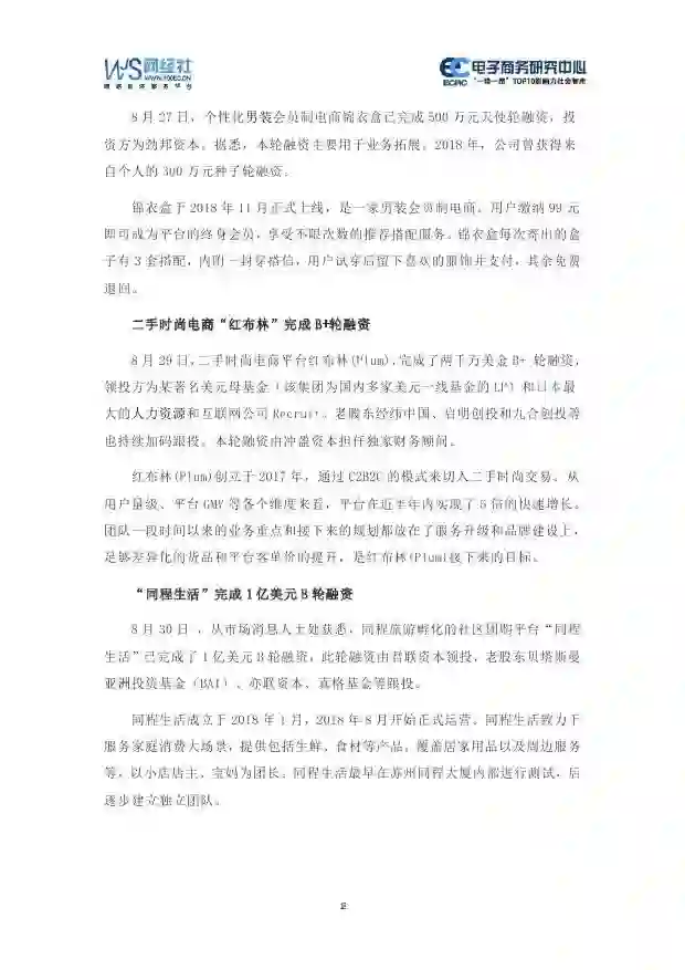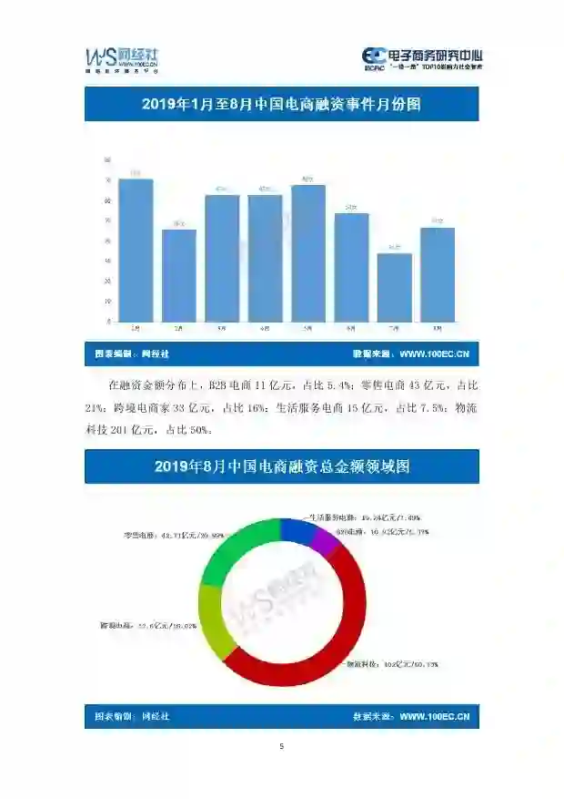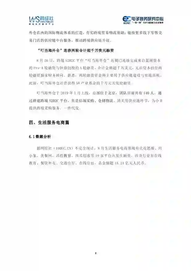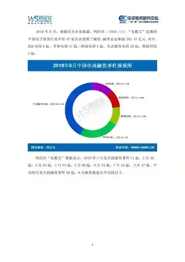 《报告》数据显示,8月中国电子商务行业共有47家企业获得了融资,融资总金额超203.47亿元。其中,B2B电商6起、零售电商11起、跨境电商5起、生活服务电商20起、物流科技5起。