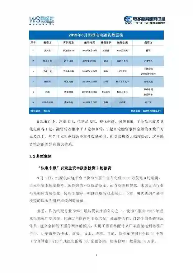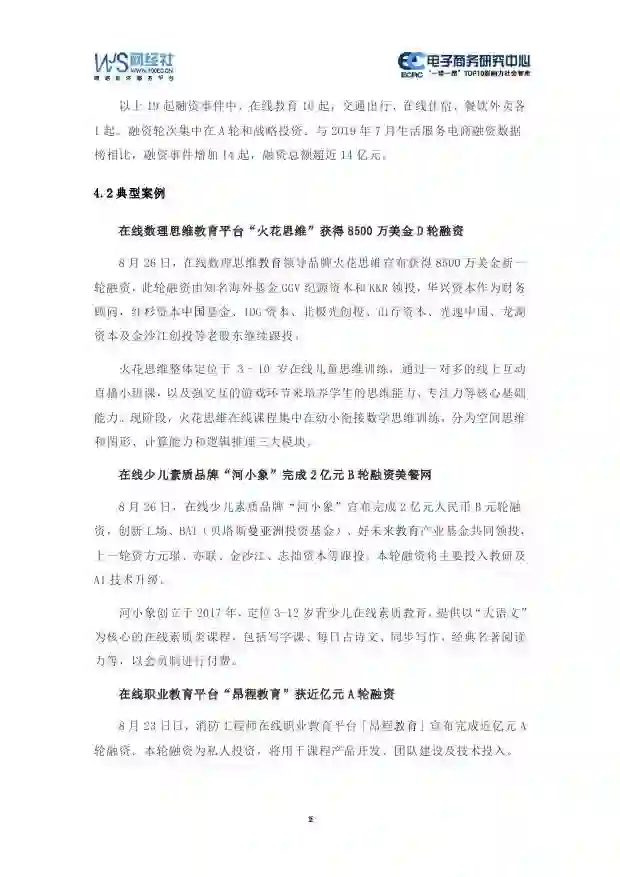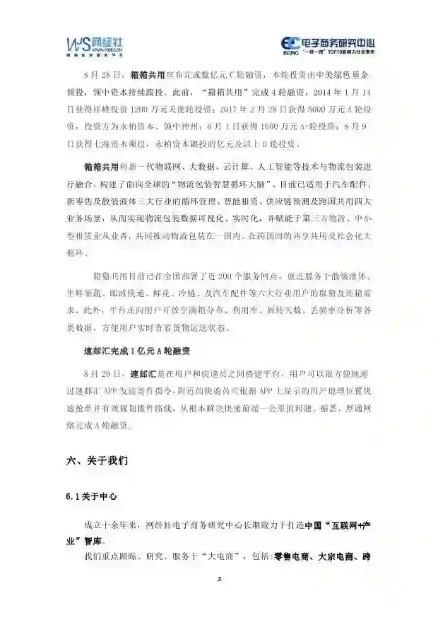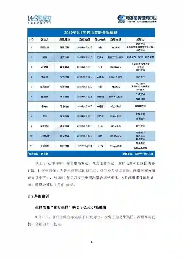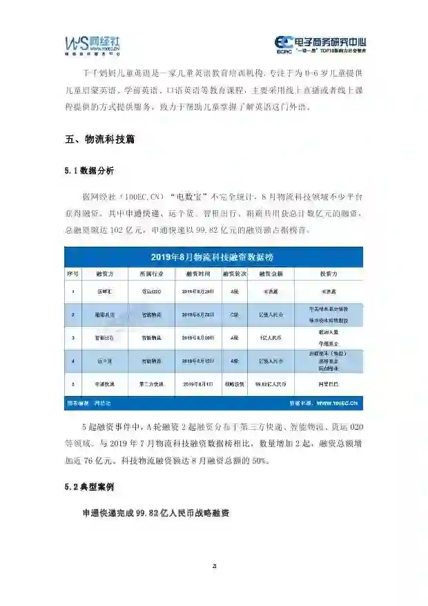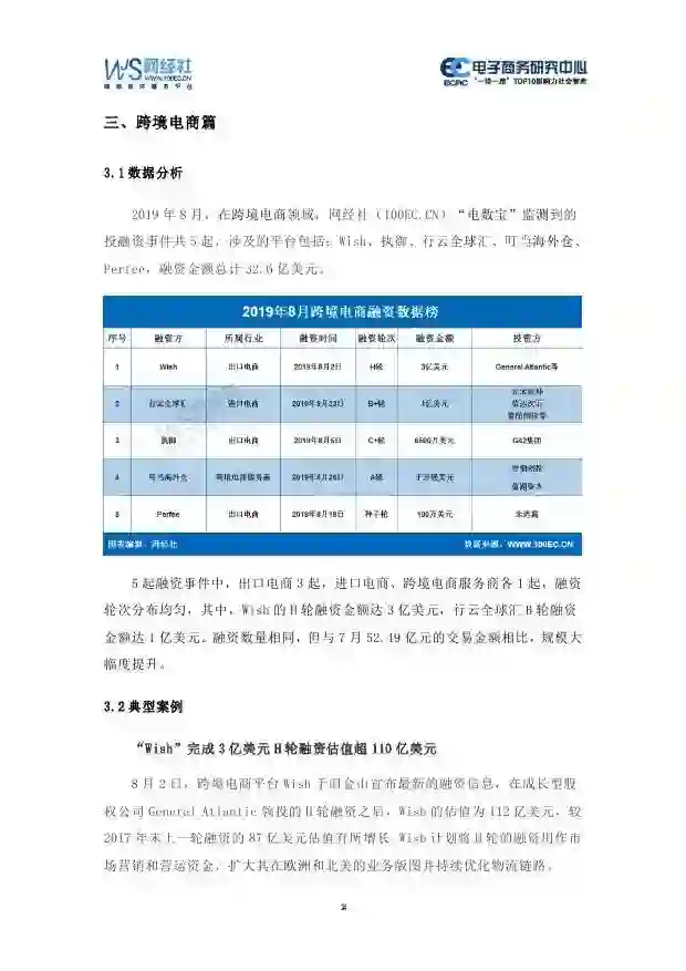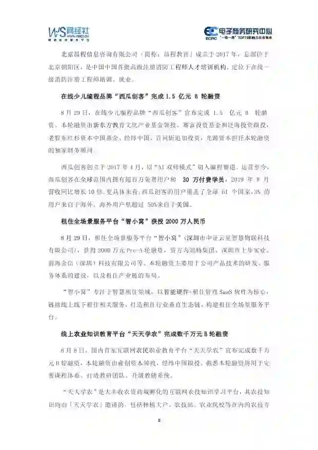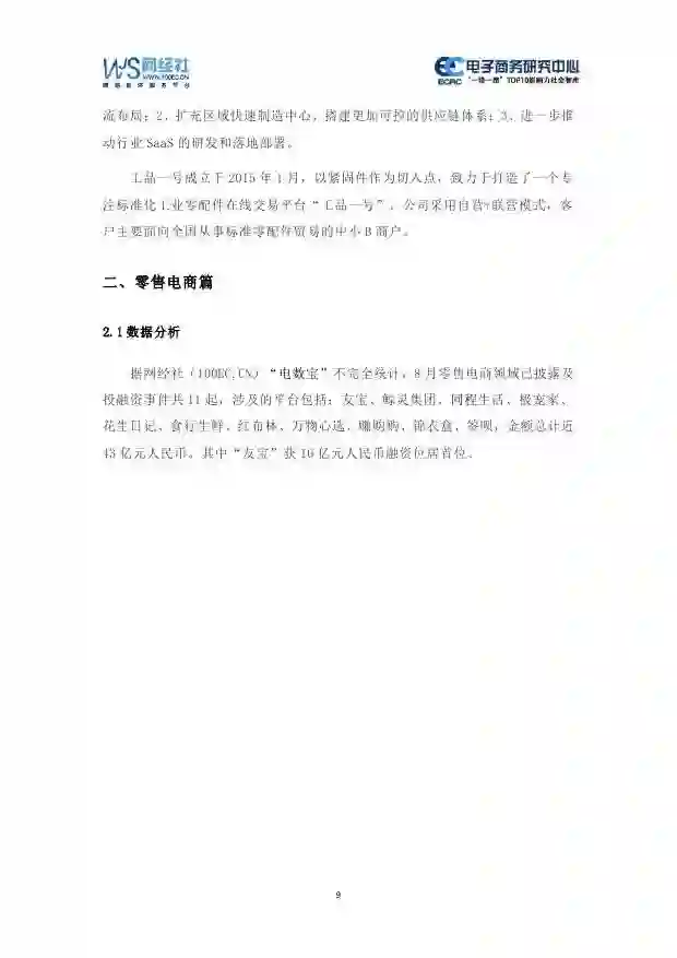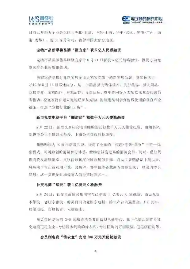 《报告》数据显示,8月中国电子商务行业共有47家企业获得了融资,融资总金额超203.47亿元。其中,B2B电商6起、零售电商11起、跨境电商5起、生活服务电商20起、物流科技5起。
