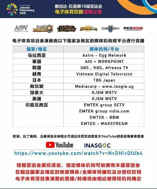 而前不久,雅加达亚运会官方公布了这次电竞项目直播的渠道信息,而其中并没有提到在中国大陆地区,甚至上面提到的决赛,官方也并且有明确的信息表示一定会播。