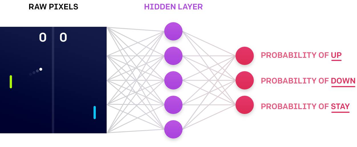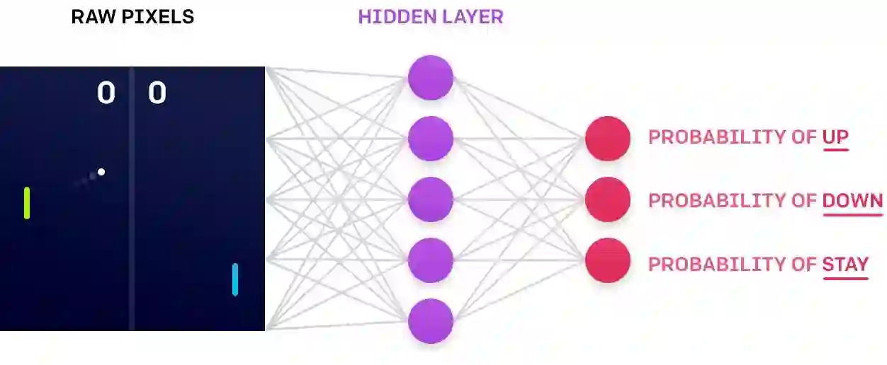 上图:在 Pong 游戏中,策略根据输入的屏幕像素来计算移动玩家拍子的概率(右边绿色的拍子):上、下或不动。