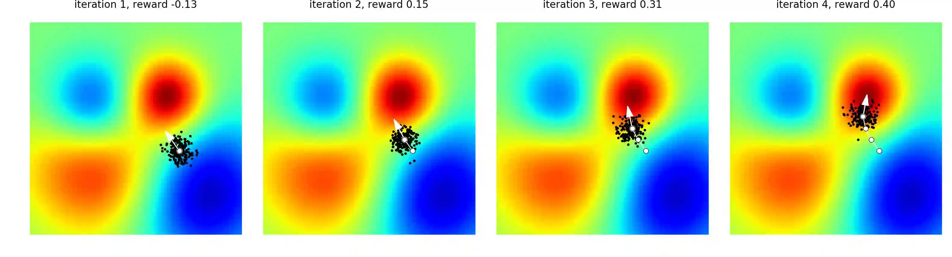 上图:进化策略优化过程,这个环境中只有两个参数和一个奖励函数(红色=高、蓝色=低)。在每次迭代,我们都会展示当前参数值(白色)、一群经过抖动的样本(黑色)和估计的梯度(白色箭头)。我们不断将该参数移动到该箭头的顶点,直到我们收敛到了一个局部最优值。你可以使用本文的代码重现这些图。
