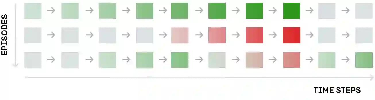 该策略的训练过程如下所示。首先是一个随机初始化,我们让该代理与环境进行一阵交互,然后收集交互的「剧情(episode)」(比如,每个 episode 就是一局 Pong 游戏)。由此我们就能得到情况的完整记录:遇到了什么样的状态序列、在每个状态采取了什么动作、每一步的奖励如何。下图给出了一个例子,这三个 episode 每个都表示在一个假想环境中的 10 个时间步骤。其中每个矩形都是一个状态,如果奖励是正面的(比如把球击回给了对方),那么矩形就是绿色;如果奖励是负面的(比如没有接到球),那么矩形则为红色: