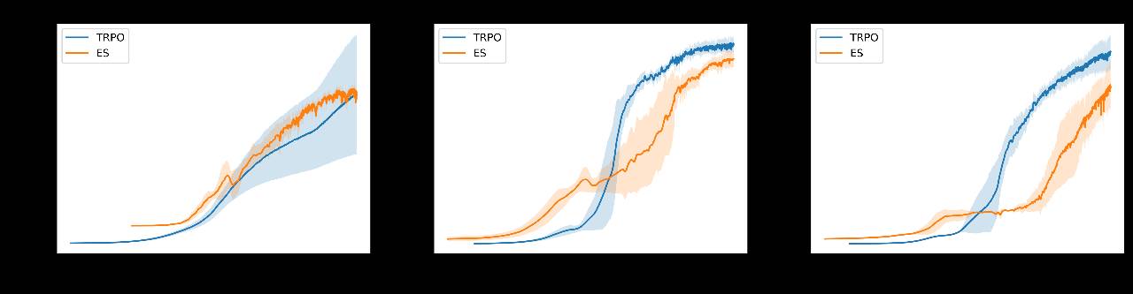 数据学习效率对比。以上对比表明进化策略(橘黄)有着与 TRPO 算法(蓝色)相媲美的表现,尽管在所有情况下它不完全匹配或超越 TRPO 算法。此外,通过水平扫描我们可看到进化策略效率略低,但不低于 1/10(注意横坐标是指数标度)。
