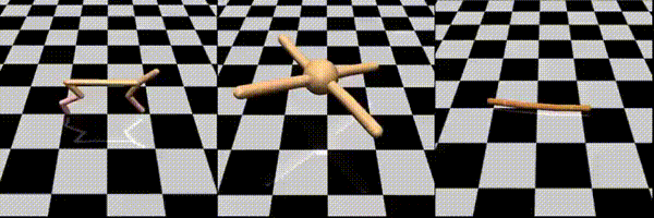 在两个强化学习基准上我们对比了进化策略和强化学习的表现:MuJoCo 控制任务和 Atari 游戏。每个 MuJoCo 任务(看以下示例)包含一个模拟身体的铰接式人物,策略网络获得所有关节的位置信息,需要输出每个关节的力矩(torques)从而前行。以下是在三个 MuJoCo 控制任务上训练的代理示例,任务目标是前行。